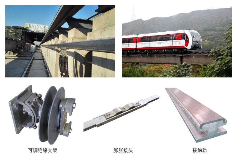 装置组成: 钢铝复合接触轨、中间接头、电缆连接板、中心锚结、膨胀接头、分段绝缘器、端部弯头、过渡弯头、绝缘支撑装置。