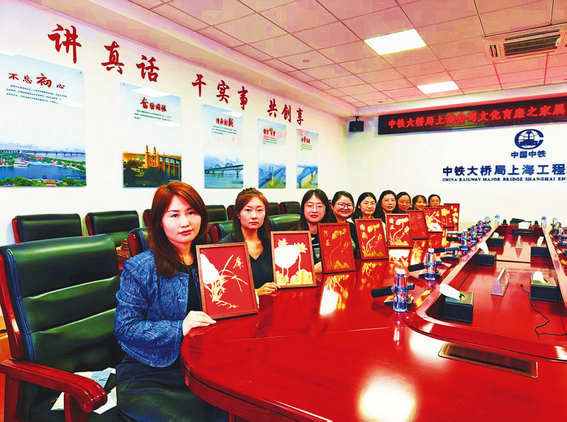 10月31日,中铁大桥局上海公司纪委开展“文化育廉之家属助廉、员工践廉”主题活动。活动包含话廉风、读廉书、送家书、寄廉语、守廉心等环节,旨在进一步凝聚家庭助廉力量,推动廉洁文化进家庭。图为员工家属展示创作的蕴含廉洁意境的金箔画。 胡骏 摄